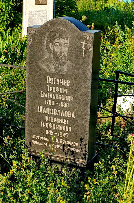 Возвращаясь назад я увидел могильную стелу с надписью: Пугачев Трофим Емельяновч, 1769-1886; Шаповалова Феврония Трофимовна, 1845 -1945. По логике вещей это означает, что здесь покоится прах потомков бунтаря Емельяна Пугачева?! Так ли это, спросил работающих на кладбище местных жителей- те и слыхом не слыхивали о таких. Вопрос очень интересный. Но это не моя сфера деятельности и чтобы что-то узнать я обратился к публикациям в интернете и только того, что так или иначе касается сына Пугачева –Трофима.