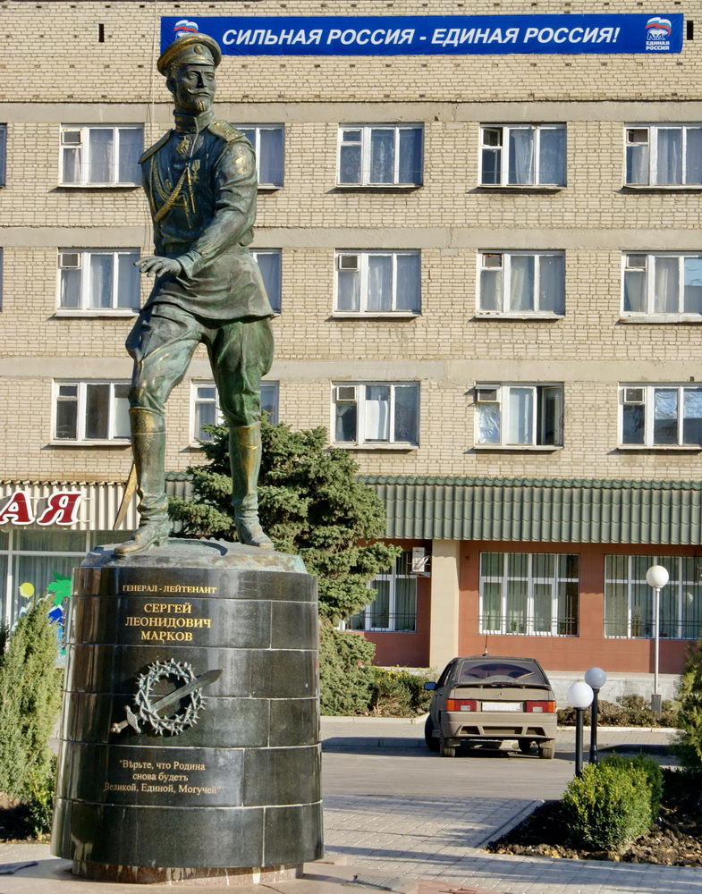 Вот два небольших материала позаимствованные из Интернета о русских людях, талантливых военноначальниках того времени. Оба — Герои Гражданской войны. Оба любили свою Родину и оба до смерти воевали за нее друг против друга. Но каждый из них уже после смерти был удостоен славы по разному. В.И.Чапаев- Герой моего времени – в Советском Союзе. С.Л.Марков – в белоэмигрантских кругах, а затем в современной России. Так в сквере, у гостиницы «Юбилейной» города Сальска 13 декабря (день гибели) 2003 года был открыт памятник генералу Маркову. Это первый в современной России памятник военноначальнику Белого движения.