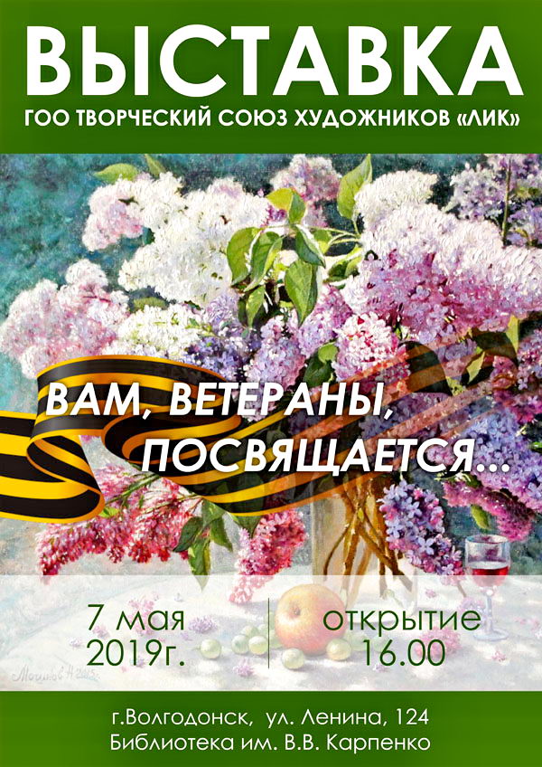 — Открытие художественной региональной выставки состоится 7 мая 2019г. в 16часов в библиотеке №9 им. В.В.Карпенко (дарственных книг) по ул.Ленина, 124.