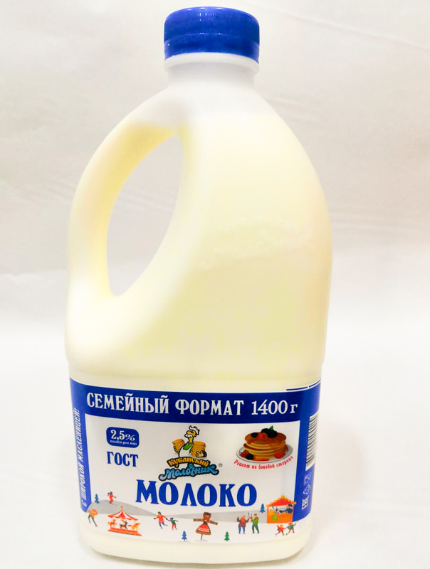 «Кубанский молочник». Молоко пастеризованное, жирностью 2.5%, масса нетто: 1400 г (ЗАО «Сыродельный комбинат «Ленинградский», Краснодарский край).