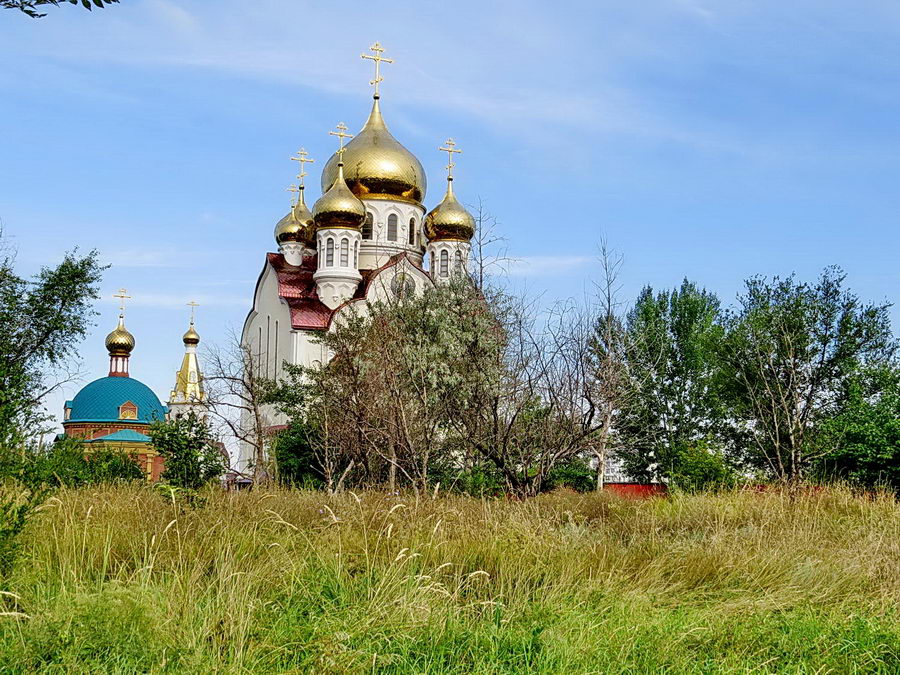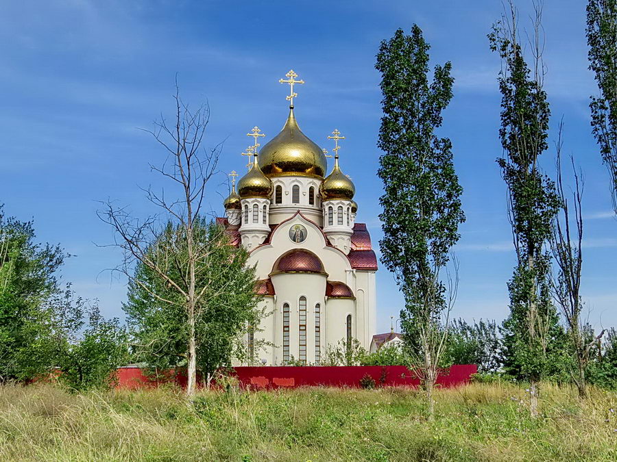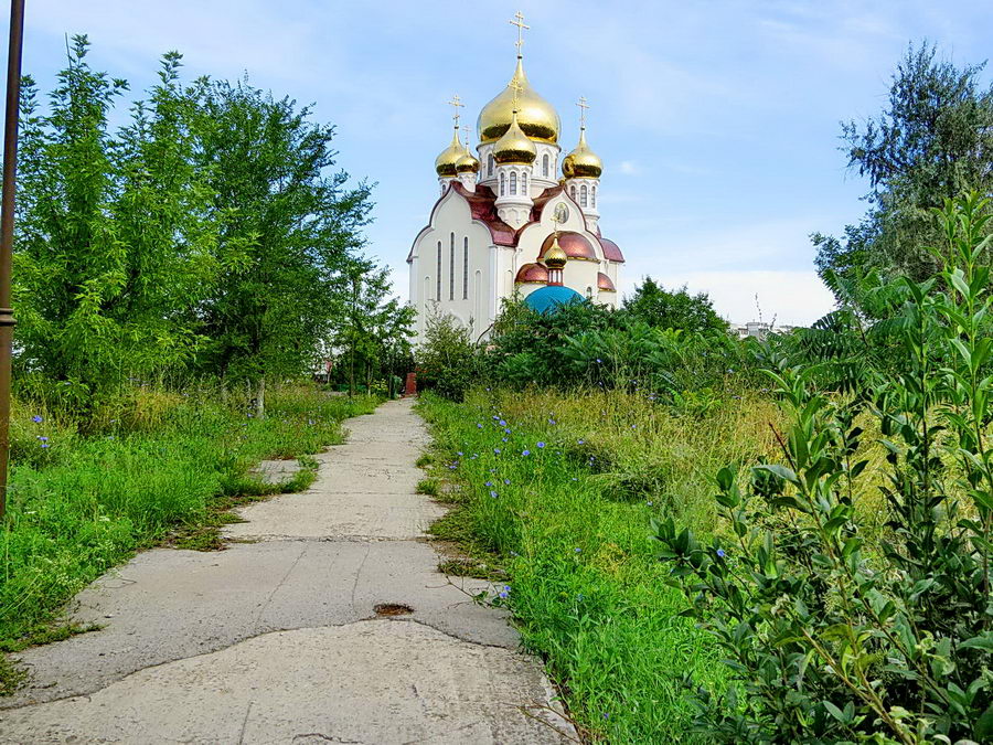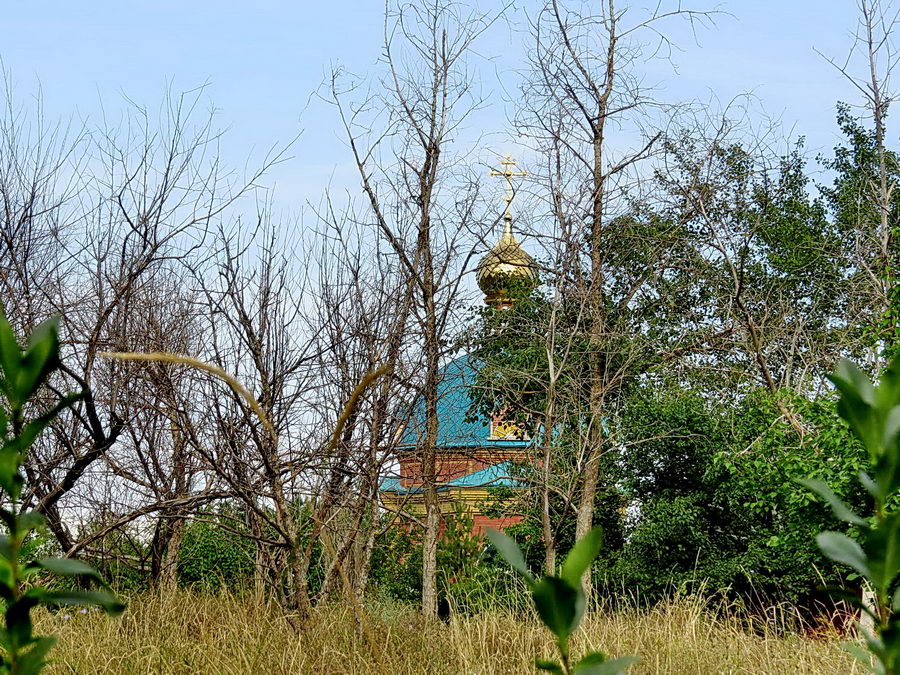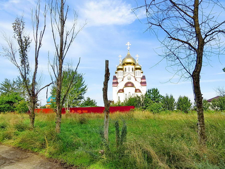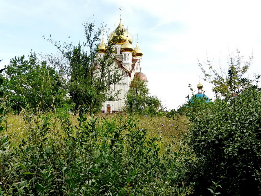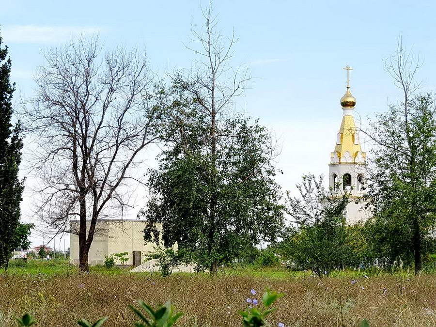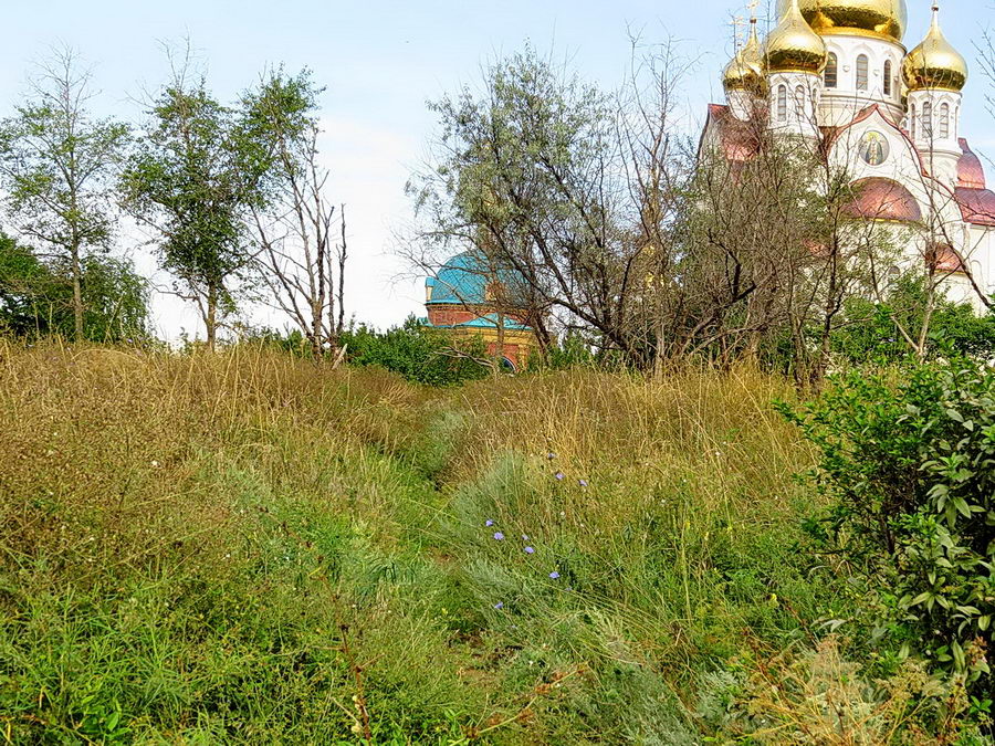 Трава по пояс взрослому человеку, бетонная дорожка, что ближе к храму просто ужасна. Вокруг десятки засохших деревьев. А ведь храм входит в так называемую «туристическую тропу» в Волгодонске. Позорище.»