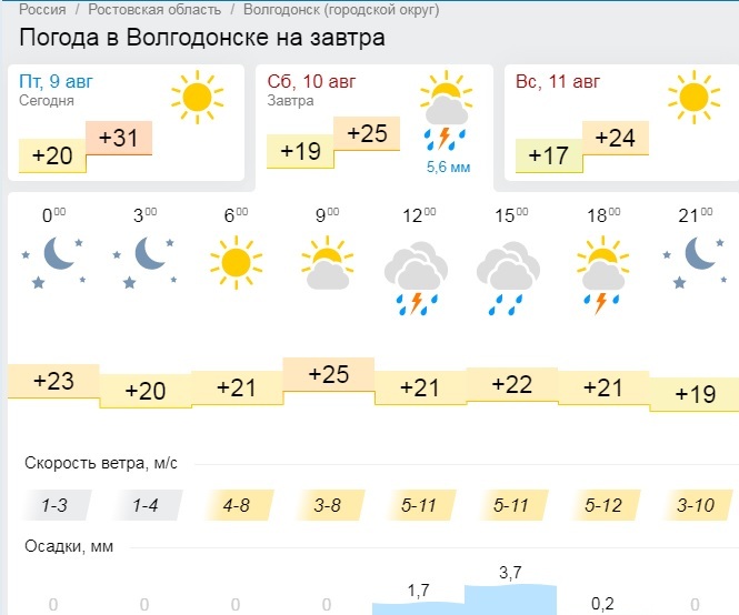 К слову, сайт Гисметео.ру дает по Волгодонску гораздо более оптимистический прогноз на завтра. Предполагается (пока), что завтра будет облачно с прояснениями, до 25 градусов тепла, а сильный дождь случится в середине дня и вечером уже сойдет на нет. Ветер нам предсказывают до 12м/с.