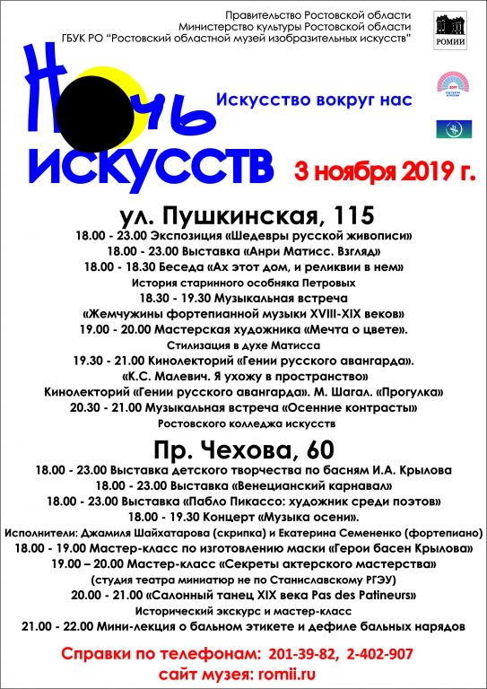 Ростовский областной музей изобразительных искусств приглашает 3 ноября с 18.00 до 23.00 весело и интересно провести время в стенах музея, посетив мероприятия программы «Ночь искусств».