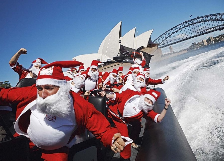 Весьма экзотично новогодние торжества проходят в Австралии. По причине отсутствия снега, елок, оленей и прочих привычных атрибутов праздника Дед Мороз появляется в плавательном костюме, на специальном ярко украшенном сёрфе на пляжах Сиднея. Причем, соблюдая традиции Старого Света, в его одежде обязательно присутствуют белая борода и красная шапочка с помпончиком на конце.