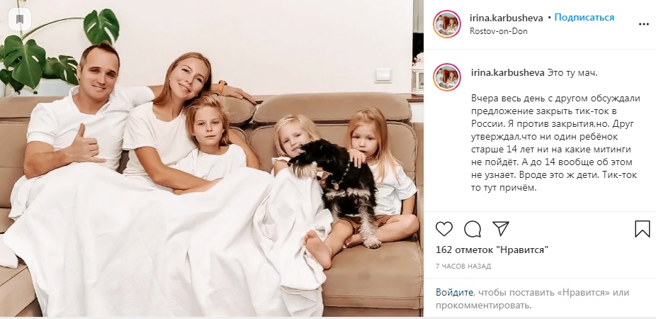 «Друзья, не могу не написать этот пост, — пишет Ксения Осокина. — Накипело! Что-то не правильное происходит! Я, как мама двоих школьников, не могу не обращать внимание на политические подстрекания!!!! Социальные сети переполнены призывами выйти на митинги 23 января и поддержать господина Навального! Никто не думает, что вся эта информация доступна нашим детям!»