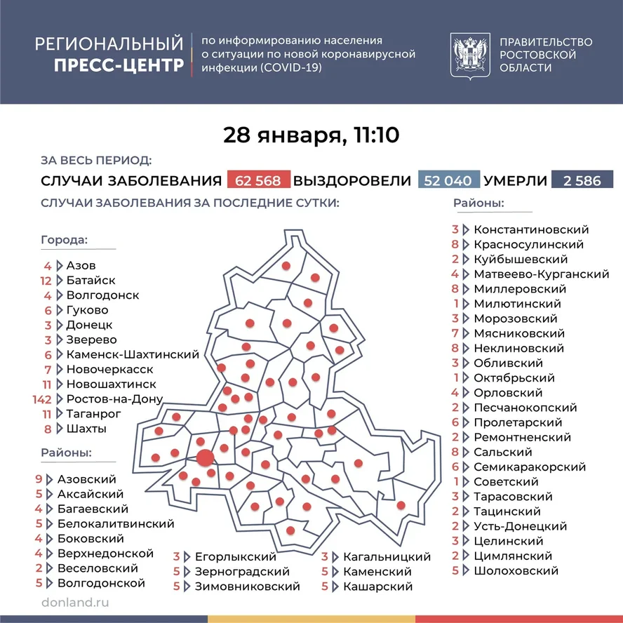 По данным Роспотребнадзора, за последние сутки число подтверждённых инфицированных коронавирусом увеличилось в Ростовской области на 375 и на утро 28 января нарастающим итогом достигло 62568. Коэффициент распространения инфекции – 0,98.