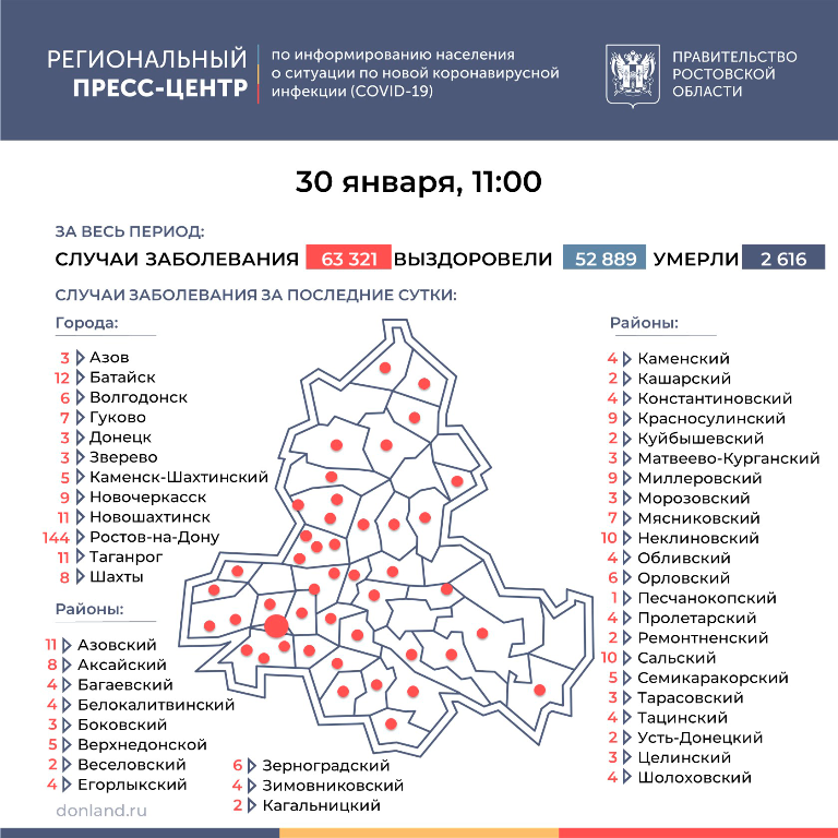 По данным Роспотребнадзора, за последние сутки число подтверждённых инфицированных коронавирусом увеличилось в Ростовской области на 376 и на утро 30 января нарастающим итогом достигло 63321. Показатель заболевших на 100 тысяч жителей – 1507. Коэффициент распространения инфекции – 0,97.