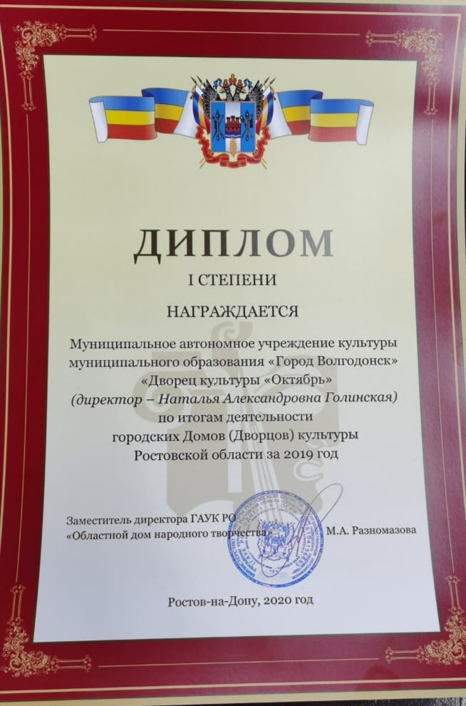 Дворец культуры «Октябрь» снова признан лучшим в Ростовской области по итогам деятельности 2019 года. Старейшее учреждение культуры города удерживает первое ранговое место среди городских Дворцов культуры Ростовской области на протяжении более 15 лет.