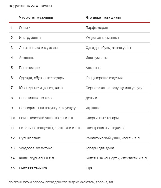 Среди желанных подарков на свой праздник мужчины чаще всего называют деньги и инструменты (причём, чем старше респонденты, тем реже они хотят деньги и чаще — инструменты), а также гаджеты, алкоголь и парфюмерию. Алкоголь, инструменты и особенно парфюмерию женщины дарят мужчинам довольно часто. Деньги и гаджеты — сравнительно редко.