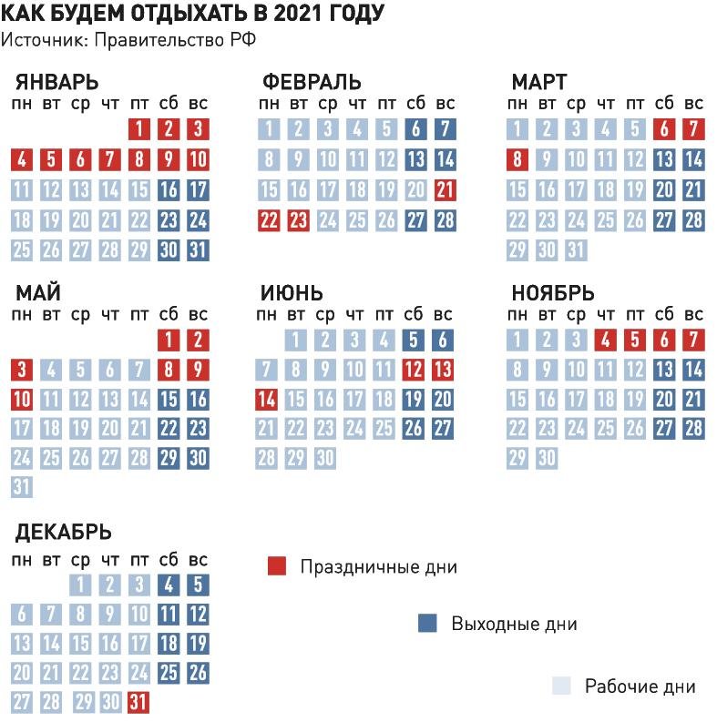 Полный календарь рабочих, выходных и праздничных дней в 2021 году от информационного партнёра «ВП» — «Российской газеты» опубликован ниже.
