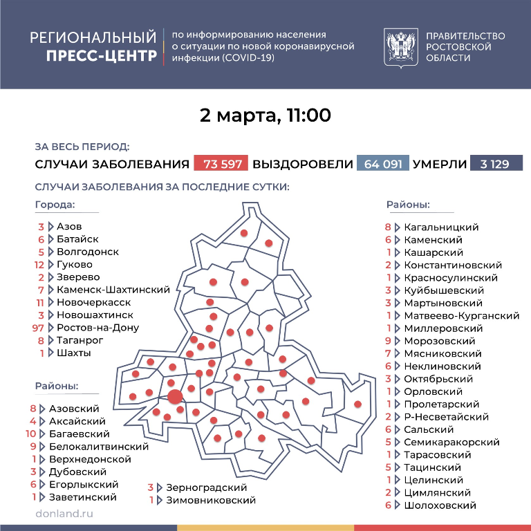 Новые инфицированные зарегистрированы в 44 городах и районах региона. Больше всего в Ростове-на-Дону (97), Гукове (12) и Новочеркасске (11).