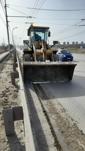 В первую очередь специалисты приступили к очистке обочин от грязи и наносного грунта на путепроводе. Работы ведутся при помощи специализированной техники – самосвала и погрузчика.