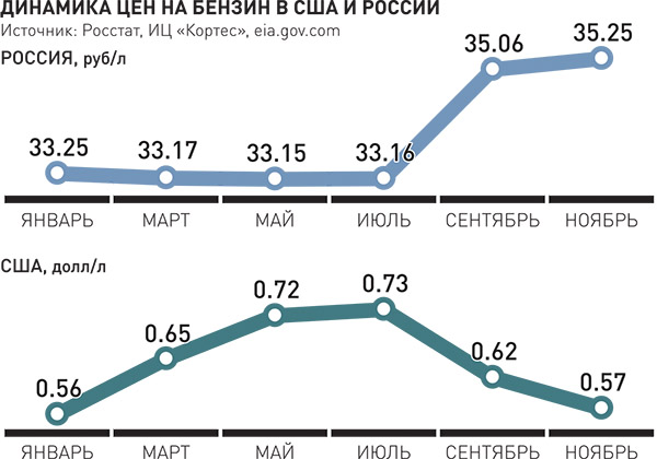 С начала года в рознице бензин подорожал за этот же период на 2,1%. При этом за три последних месяца стоимость бензина на бирже выросла более чем на 20%, а с начала года почти на 12,5%.