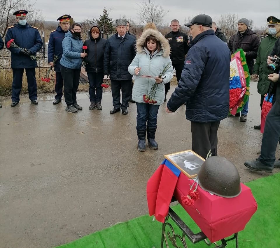 Завершилась церемония минутой молчания, участники возложили венки и цветы к месту захоронения. Родственникам погибшего бойца передан «Сертификат памяти», учрежденный Российским Союзом ветеранов.