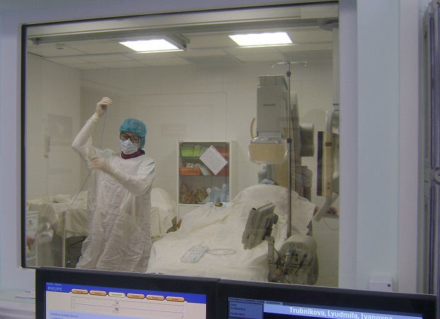 Для пациента рентгеннагрузка — не более чем при флюорографии, но для персонала — весьма ощутима, т.к. таких исследований в день бывает много. Максимальное количество операций за один день в практике самого Фоменко – семь. Поэтому он, как и каждый хирург, стоящий за ангиографом, надевает для защиты от рентгенизлучения защитную форму, которая весит больше, чем бронежилет — 20 килограммов. На войне как на войне.
