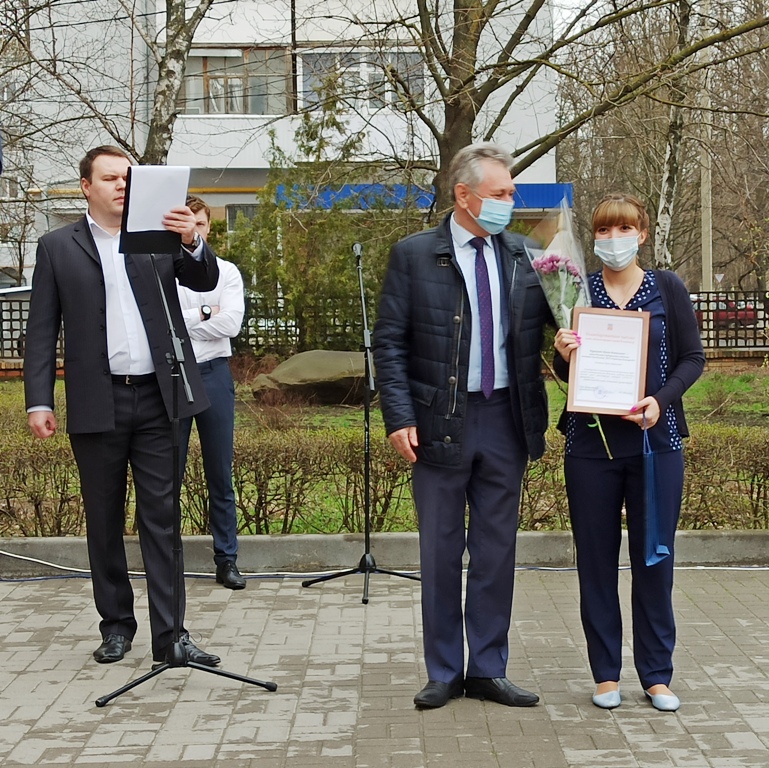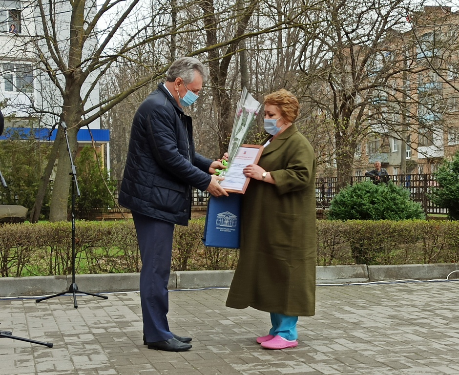Вчера прямо во дворе здания на Советской состоялся небольшой праздник для персонала «ковидного» госпиталя. Смогли в нем участвовать, разумеется, только те медработники, которые не были на тот момент задействованы на работе в «красной зоне». Глава администрации Волгодонска Виктор Мельников торжественно вручил им благодарственные письма администрации города.