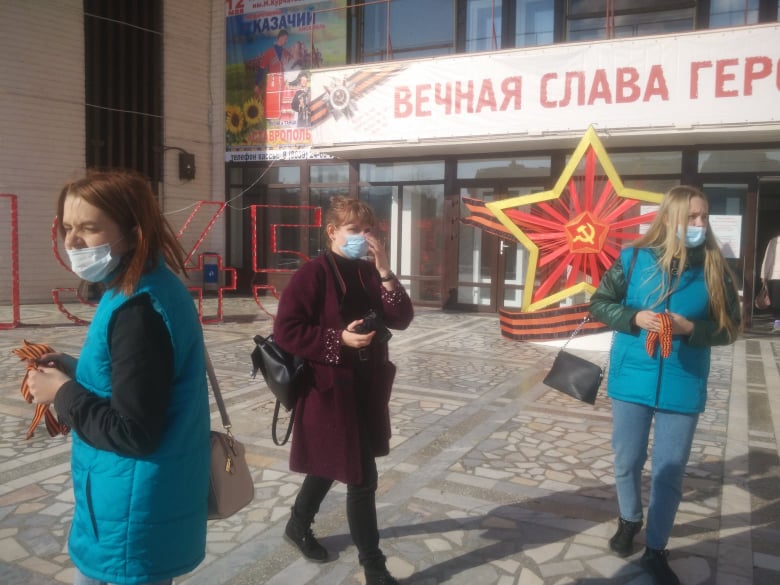 «Девочки, вы же в курсе, как правильно носить ленточку? У сердца. В волосы не заплетаем, к сумкам не привязываем», — спрашивают у подростков волонтёры — в их задачу также входит информировать граждан о том, как правильно носить георгиевскую ленточку.