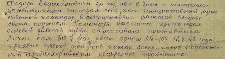 Из воспоминаний Фёдора Евдокимовича: «Прошел школу младшего командного состава – и на фронт. Мне сразу дали взвод. Контузило. Отправили в полевой госпиталь. Подлечили – и снова в бой. После госпиталя попал в разведроту. Стал старшиной».