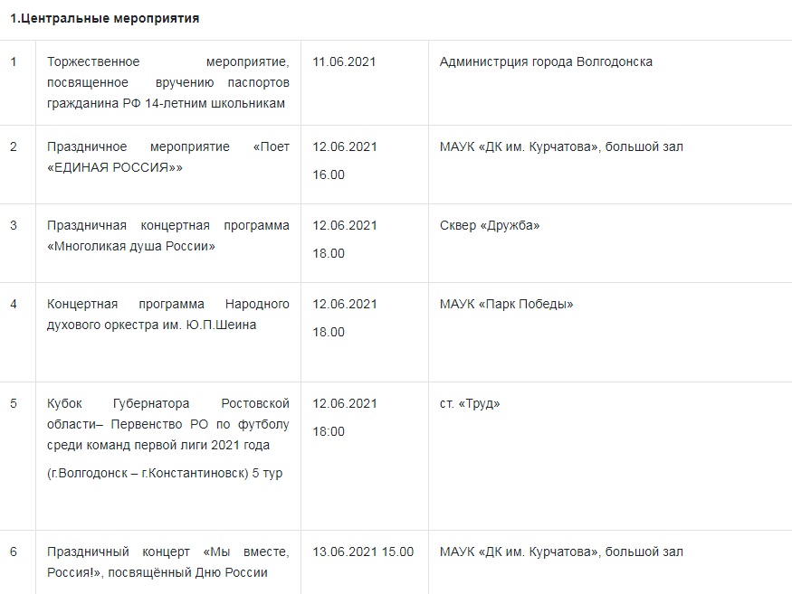 Среди центральных событий по традиции состоится вручение первых паспортов 14-летним школьникам, концерт партийцев «Единой России», концертные программы в сквере «Дружба» и парке Победы, а также футбольный матч среди команд первой лиги за Кубок губернатора Ростовской области на стадионе «Труд».