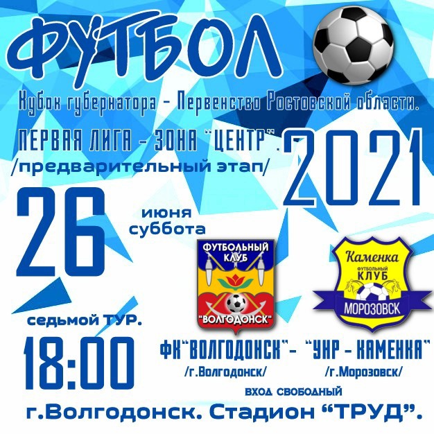 В субботу, 26 июня, в г.Волгодонске состоится матч 7-го тура на Кубок губернатора — Первенство Ростовской области по футболу среди команд Первой лиги зоны «Центр». Соперник — «УНР — Каменка» г.Морозовск. Спортивный поединок пройдёт на стадионе «Труд». Начало в 18:00. Вход свободный
