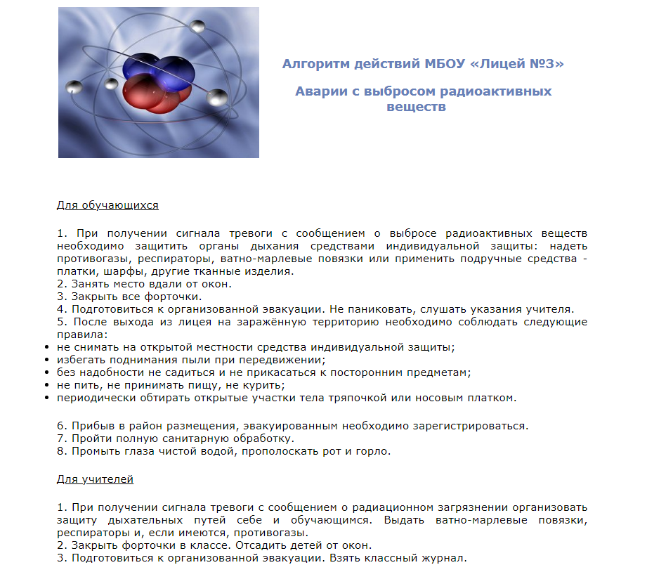Алгоритм действий при аварии на атомном объекте с выбросом радиации я нашла только на сайте лицея №3 города Курчатова Курской области. После паники, связанной с пожаром на стройплощадке третьего блока Ростовской АЭС в 2012 г. сайт Роспотребнадзора Ингушетии также опубликовал пошаговую инструкцию для населения.