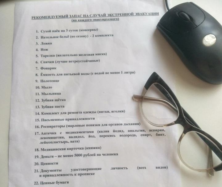 Начну с того, что поделюсь рекомендациями о минимальном запасе на случай экстренной эвакуации для одного человека. Из личного архива. Распечатка от спасателей хранится у меня с весны 2011 г., когда, в составе Гражданской палаты Волгодонска, мы организовывали «круглый стол» с целью добиться строительства в городе третьего моста, дабы обеспечить безопасность населения при аварии на АЭС. Кстати, невероятно, но в 2020-м мост, наконец, начали строить!