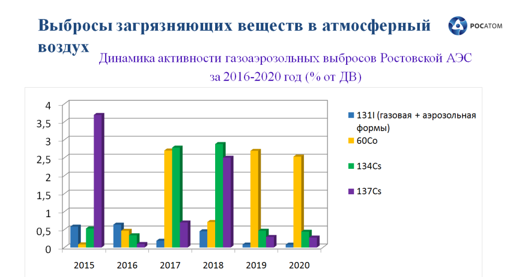 Выбросы загрязняющих веществ в атмосферу по йоду-131, кобальту-60, цезию-134 и цезию-137: за последние 5 лет они ниже предела обнаружения используемой аппаратуры.