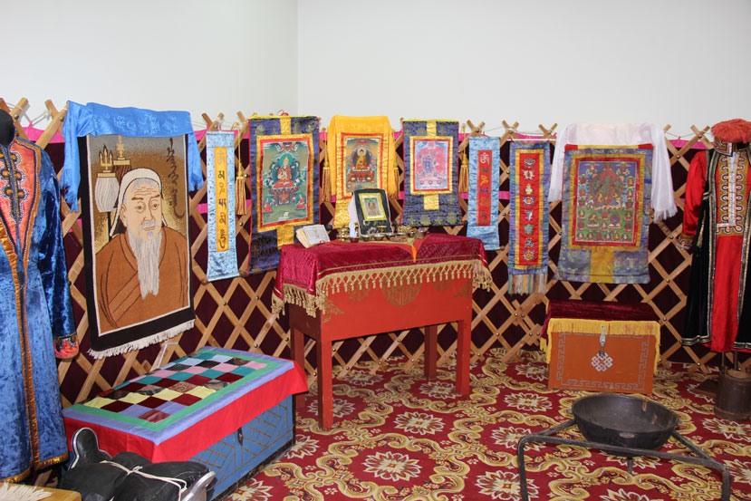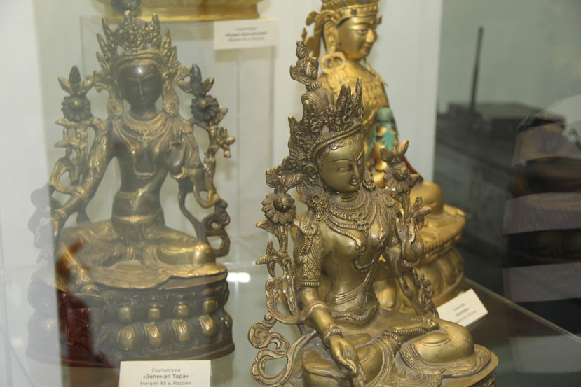 Центральная часть экспозиции – алтарь, представленный буддийскими иконами-танками, скульптурой и предметами религиозного культа. Выставка дополнена предметами декоративно-прикладного искусства, выполненными с величайшим мастерством и тонким вкусом, а также пейзажами с изображением калмыцкой степи и картинами духовной жизни современных художников.