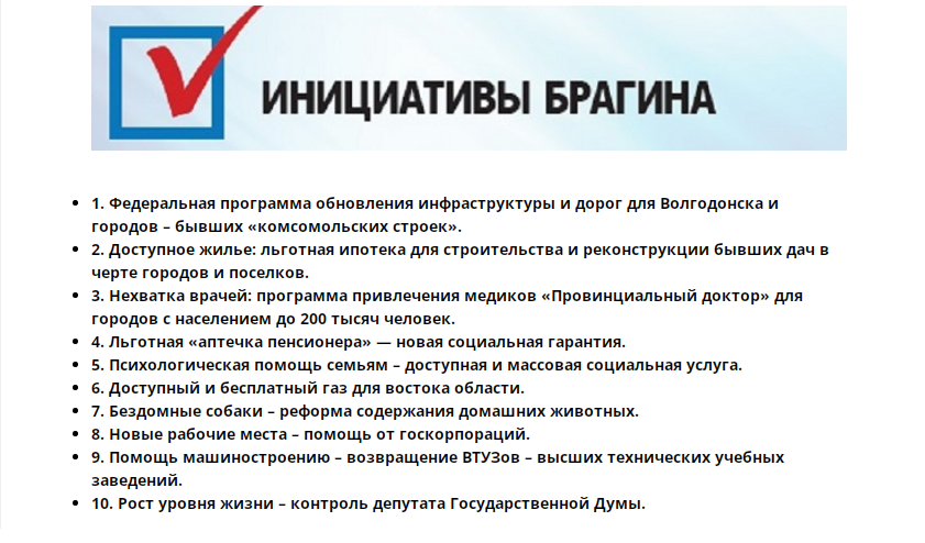 Но ещё раньше, когда предприниматель Владимир Брагин создавал и развивал свой «Город счастья», чтобы понять как и куда «вписывать» свой бизнес — новую стройку, ему пришлось изучить весь Волгодонск, столкнуться со всеми его болевыми точками. Стало ясно: чтобы менять к лучшему жизнь в городе, нужен выход на федеральный уровень.