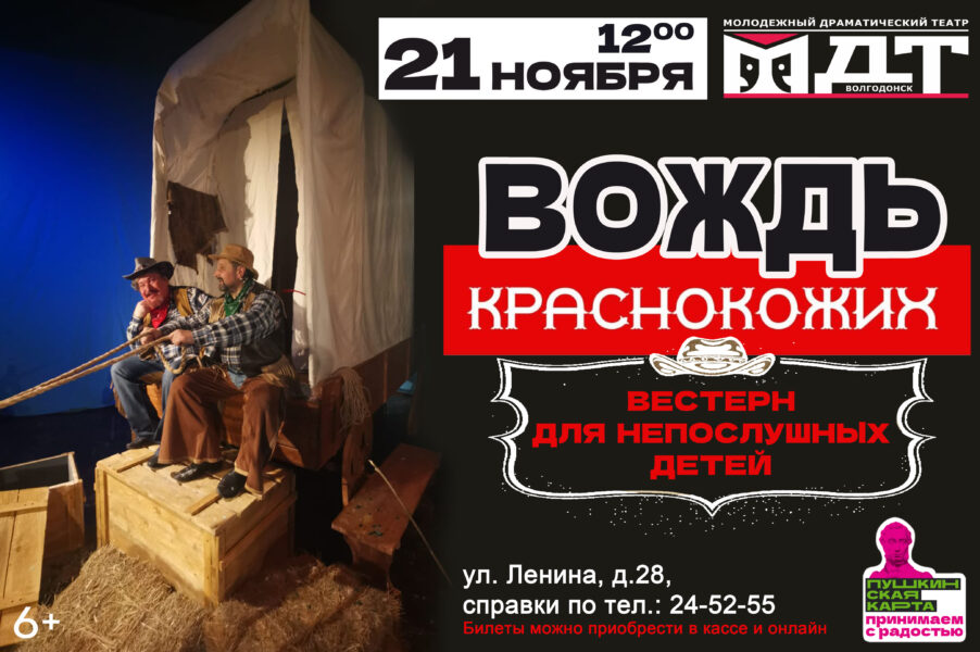А в воскресенье, 21 ноября, артисты театра покажут спектакль для юных зрителей и их родителей «Вождь краснокожих» — по юмористической новелле американского писателя О.Генри. Эта широко известная и неоднократно экранизированная история о двух авантюристах, которые похитили мальчишку ради выкупа. Но сорванец и выдумщик Джонни устраивает своим похитителям такую «веселую» жизнь, что они мечтают только о том, как бы поскорее от него избавиться.