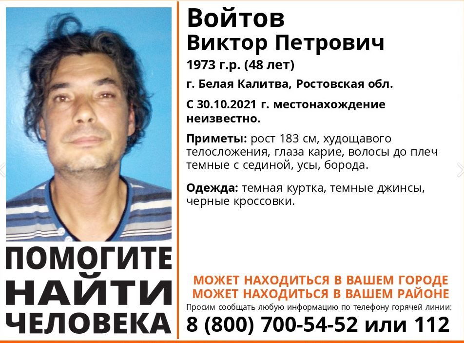 В Белой Калитве разыскивают без вести пропавшего 48-летнего Виктора Войтова. О его местонахождении ничего не известно уже более трех недель. Как сообщили волонтеры поискового объединения «Лиза Алерт Юг», мужчина пропал 30 октября.
