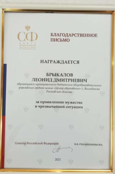 Пятиклассник Центра образования Волгодонска Леонид Брыкалов получил Благодарственное письмо Сенатора Российской Федерации Ирины Рукавишниковой за проявленное мужество в чрезвычайных ситуациях.