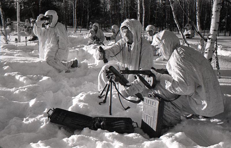 Миномётчики подразделения лейтенанта Кирильцева ведут наблюдение за передовой линией обороны противника. Московская область Ноябрь 1941Фото: Л. Великжанин РГАКФД. Арх. № 0–177109