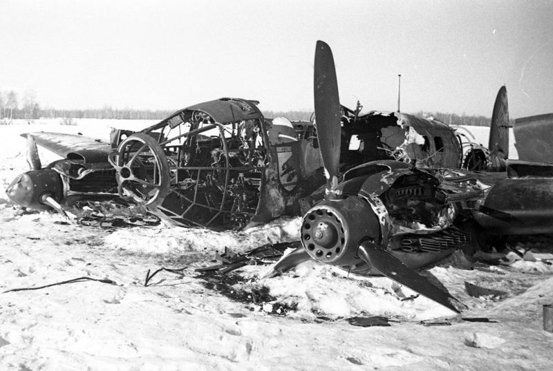 Сбитый немецкий самолет Хе 111. Западный фронт. 1941 год.Фото: В. Гребнев. РГАКФД, Арх. № 0-286588