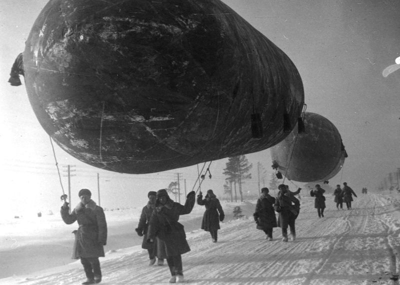 Транспортировка газа для аэростатов воздушного заграждения. Москва. Декабрь 1941 года.Фото: Фотограф не установлен. РГАКФД. Арх. № 0-95817