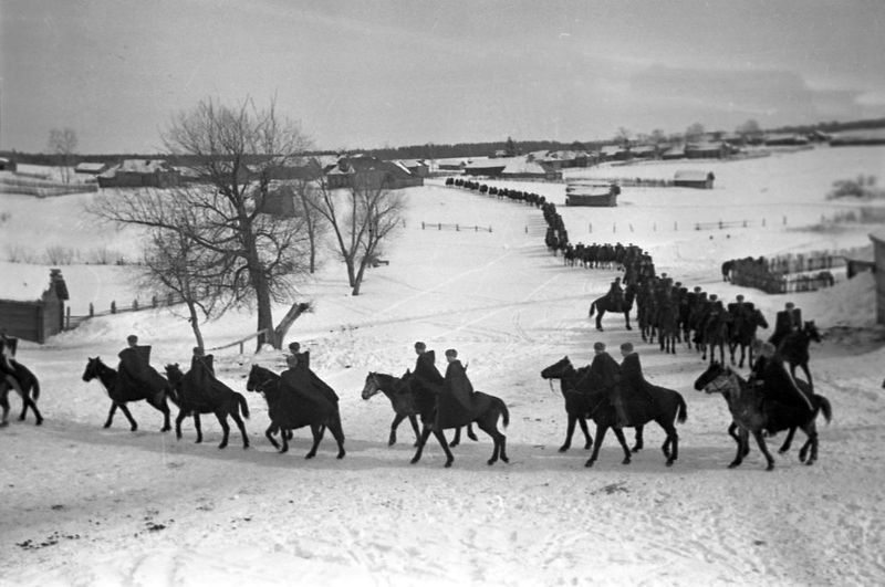 Части гвардейског кавалерийского корпуса под командованием генерал-майора Л.М. Доватора направляются на передовые позиции. Московская область 1941 год.Фото: А. Шайхет. РГАКФД. Арх. № 0–144442 (А)