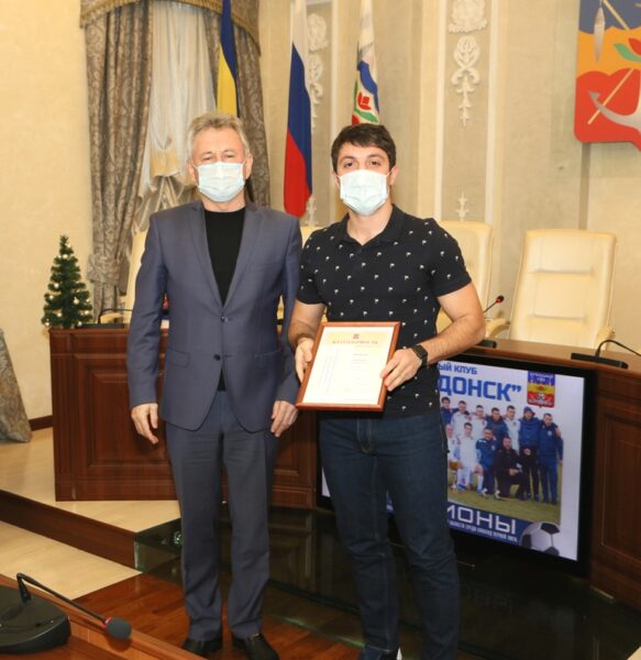 Сергей Николаевич поздравил футболистов с победой в областном первенстве, пожелал не останавливаться на достигнутом и вручил благодарности от городской Думы – главы города президенту футбольного клуба «Волгодонск» Сергею Морозову, игрокам, администратору и пресс-атташе клуба.