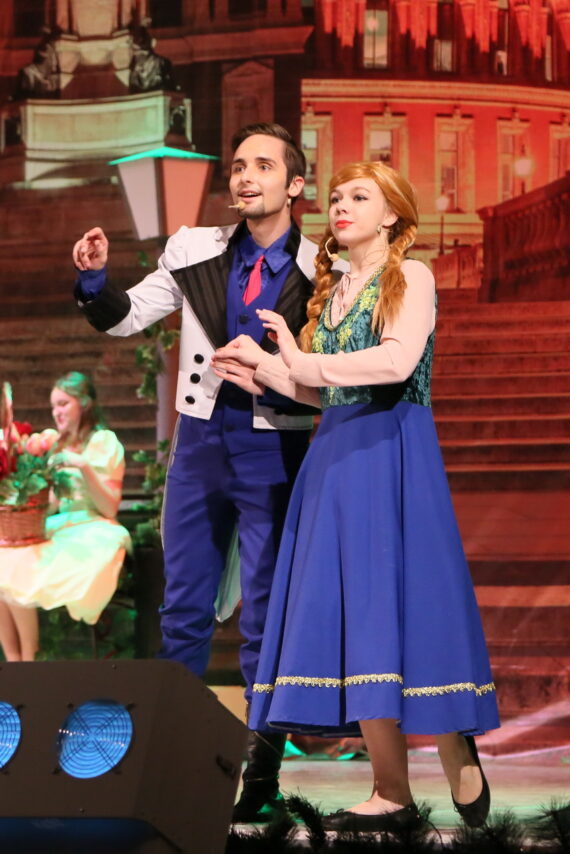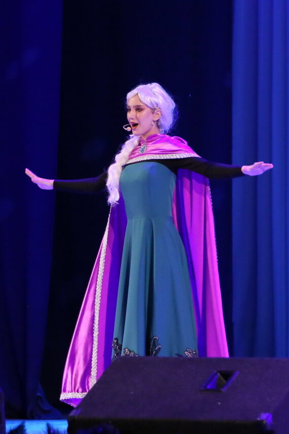 Коллектив дворца культуры постарался создать праздничное настроение уже у входа – здесь гостей встретила новогодняя светодиодная зона, а в фойе первого этажа, полностью оформленном в лилово-сиреневой цветовой гамме, разместилась welcome-зоне с героями музыкального спектакля «Холодное сердце» и ростовыми куклами.