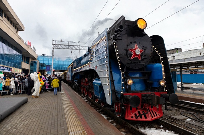 Состав во главе со старинным тепловозом, украшенным новогодней звездой, прибыл на главный железнодорожный вокзал 2 января.