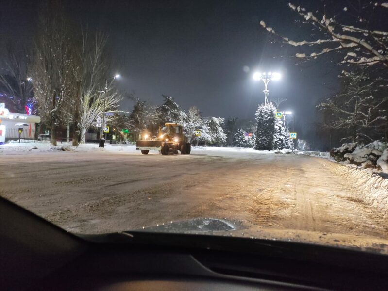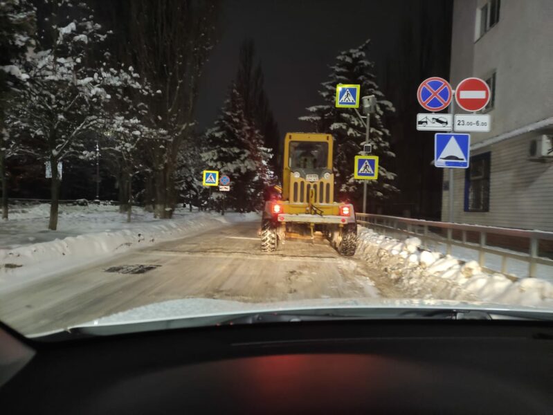 Снегопад в Волгодонске начался вечером 27 января. С 19.00 на дороги города была выведена спецтехника – начали обрабатывать проезжую часть пескосоляной смесью. К уборке снега приступили с 2 часов ночи.