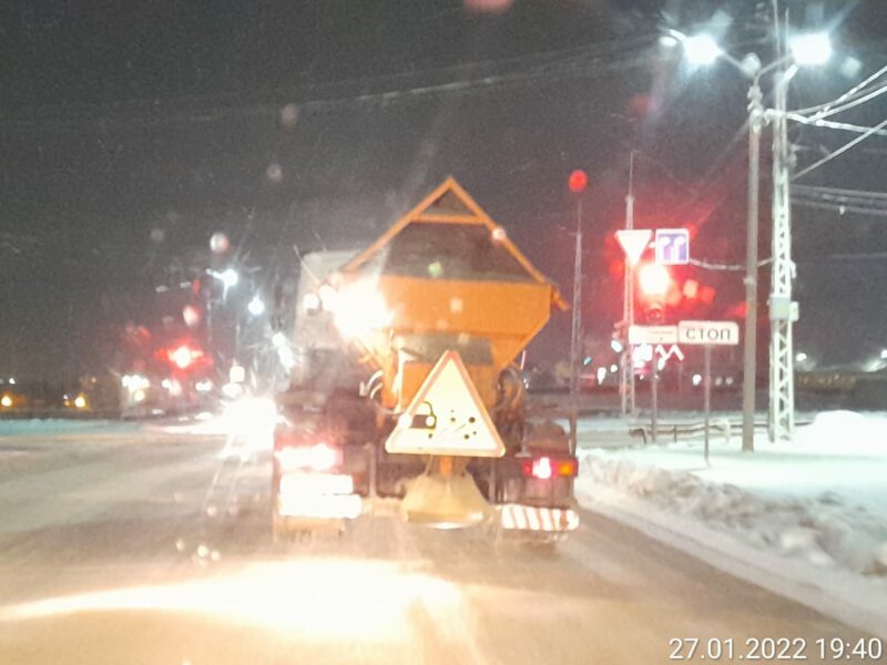 В городе продолжается очистка дорог и тротуаров, остановочных павильонов и посыпка пескосоляной смеси.