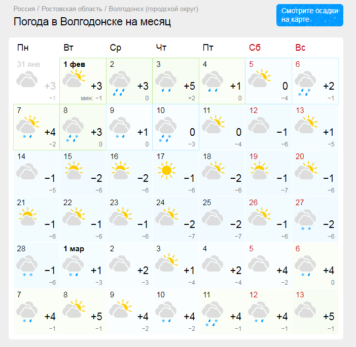 В Волгодонске февраль будет и того мягче. Наиболее низкие ночные температуры — от минус 4 до минус 7 градусов — установятся 11 числа и продержатся до 28-го.