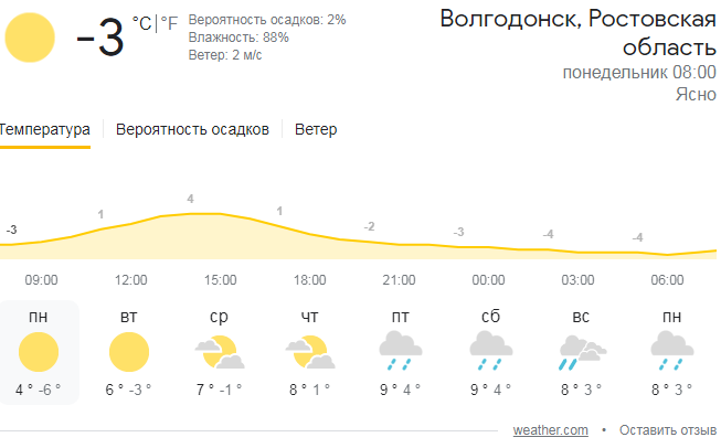 В Волгодонске сейчас минус 4, днём потеплеет до плюс 4-х градусов. В последующие двое суток днём также будет по весеннему тепло — от плюс 5 до плюс 7 градусов. Ночами — незначительный мороз.