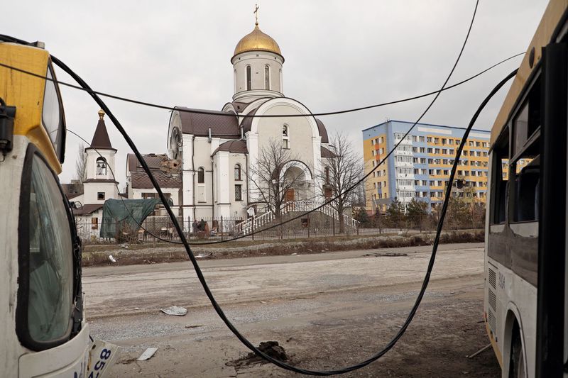 Идем мимо разрушенных, сгоревших домов. Признаюсь, я даже не подозревал, что панельные многоэтажки могут так сильно гореть. На обочине — смятый, словно пластилиновый трактор, у поворота — изрешеченный троллейбус на спущенных колесах. Раздавленные легковушки, по которым проехалась тяжелая военная техника. Еще одна машина, заваленная обломками здания. Развороченные взрывной волной ворота церковной ограды. За ними — побитый взрывами и посеченный осколками храм.