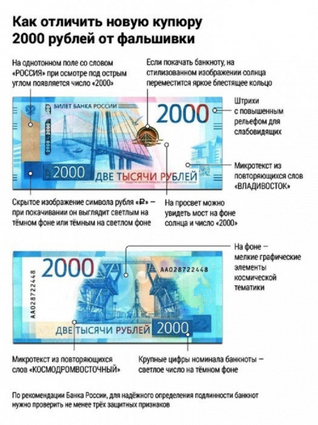 В настоящее время на территории Ростовской области стали распространяться фальшивые денежные купюры номиналом 2000 рублей, имеющие высокое качество подделки. В этой связи полиция напоминает гражданам ряд основных признаков для определения подлинности банкноты без специальных приборов.