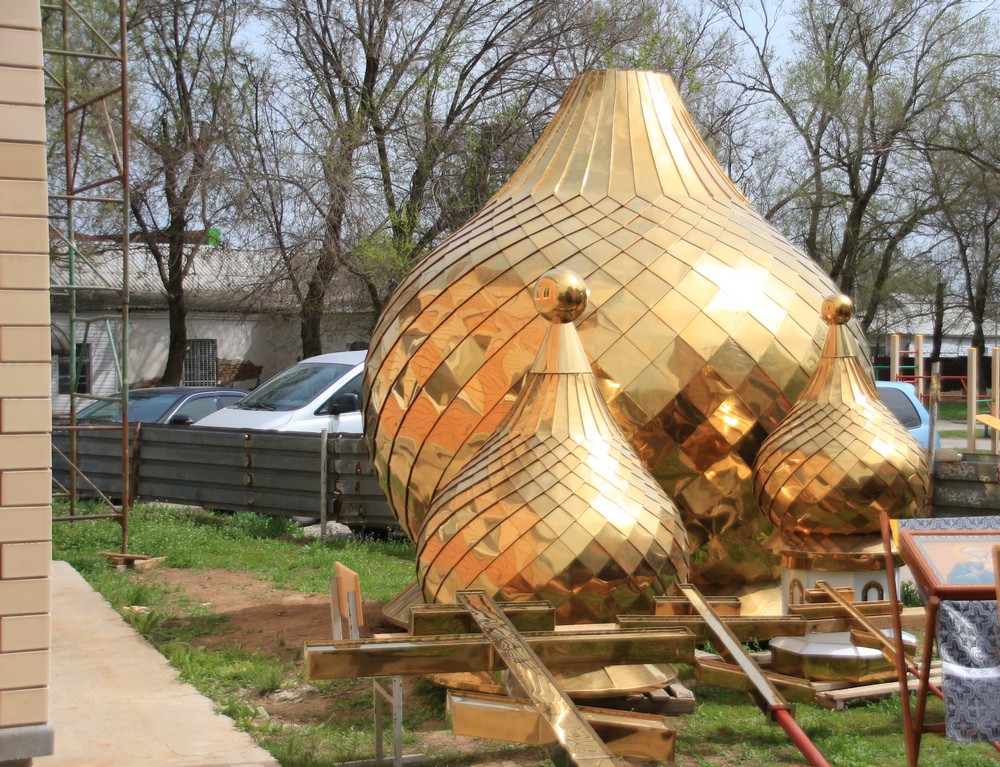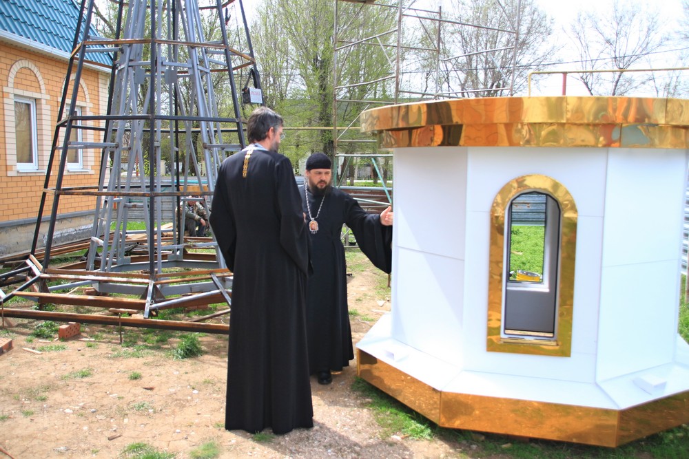 По словам настоятеля прихода иерея Алексия Захарова, к празднику Светлой Пасхи планируется водрузить основной купол, а к престольному празднику, который будет отмечаться 2 мая, здание храма украсят все три купола.