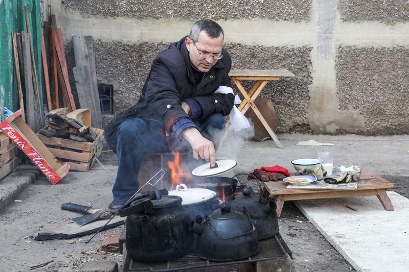 Бывший мастер прокатного цеха завода «Азовсталь» Иван Никифоров из шашлычного мангала соорудил печь для приготовления пищи, а из древней газовой плиты — духовой шкаф. Там на Пасху выпекали праздничные куличи. Только повара знают, сколько умения и труда надо приложить, чтобы испечь в таких условиях сдобу. Причем мариупольский кулич вышел не хуже, чем у кондитеров в кафе, — с цукатами и изюмом. Я попробовал — вкус изумительный, только дымком от костра пахнет.