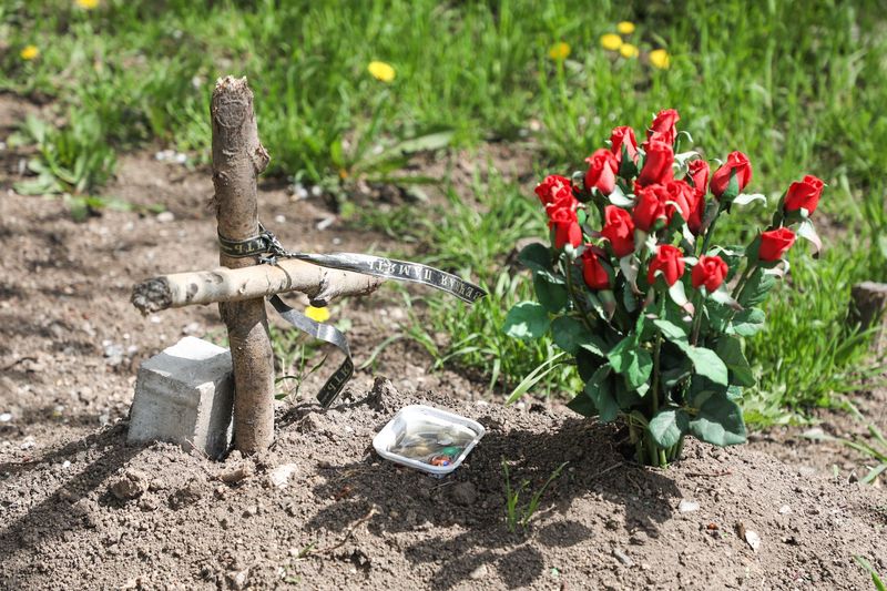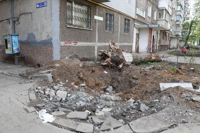 — Нет — это наша инициатива. Чего в квартире сидеть и ждать у моря погоды. Да, два месяца было страшно, да, были прилеты (показывает на огромную воронку), шли перестрелки, да были убитые (показывает на братскую могилу во дворе), но надо самим менять жизнь к лучшему. Если сидеть и горевать, то ничего не выйдет. Слезами делу не поможешь. Сегодня вскопаем клумбы, завтра — побелим бордюры и деревья, приготовимся к празднику, — говорит Елена Гончарова.