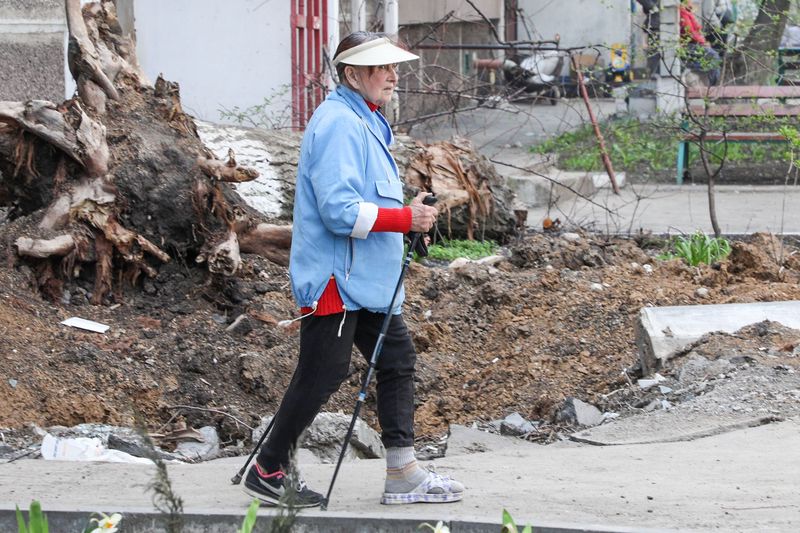 Возле десятиэтажного дома N60 на бульваре Морском — женщина с пожилым мужчиной окапывают клумбу, вырывают сорняки и траву. Другая женщина метет тротуар перед подъездом — крошево из битого стекла, камней и железных осколков отправляются в воронку. Знакомимся.