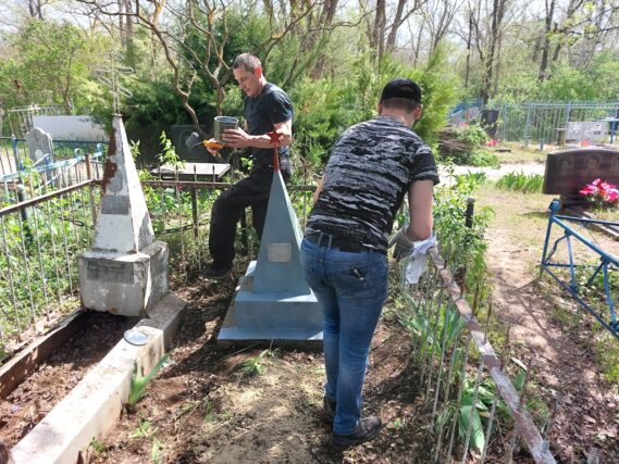 Участники трудового десанта произвели спил сухой растительности, убрали с территории захоронений большое количество мусора, сухих веток, травы, выполнили покраску памятников и надгробий.